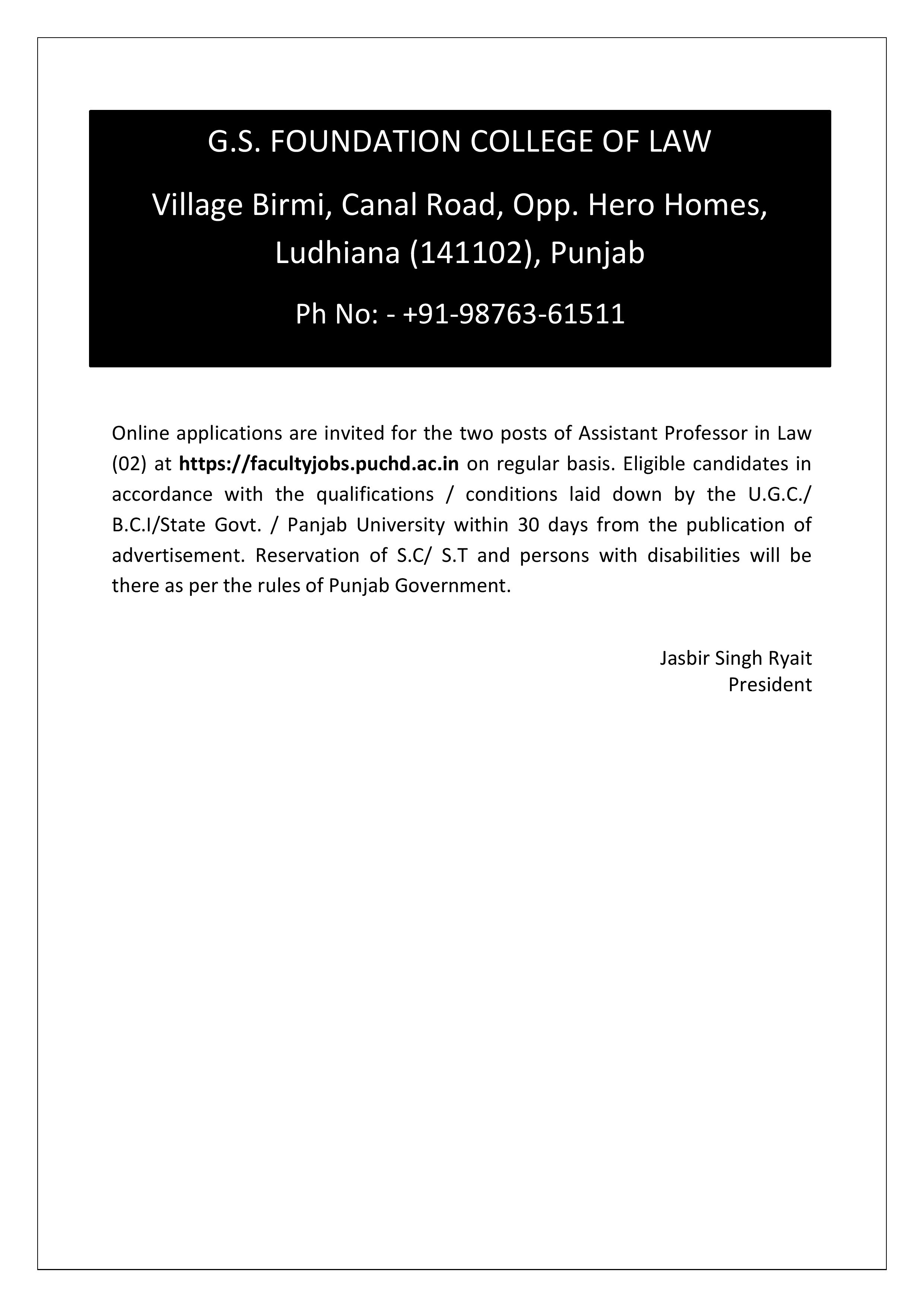 G.S. FOUNDATION COLLEGE OF LAW Village Birmi, Canal Road, Opp. Hero Homes, Ludhiana (141102), Punjab Ph No: - +91-98763-61511 Online applications are invited for the two posts of Assistant Professor in Law (02) at https://facultyjobs.puchd.ac.in on regular basis. Eligible candidates in accordance with the qualifications / conditions laid down by the U.G.C./ B.C.I/State Govt. / Panjab University within 30 days from the publication of advertisement. Reservation of S.C/ S.T and persons with disabilities will be there as per the rules of Punjab Government. Jasbir Singh Ryait President