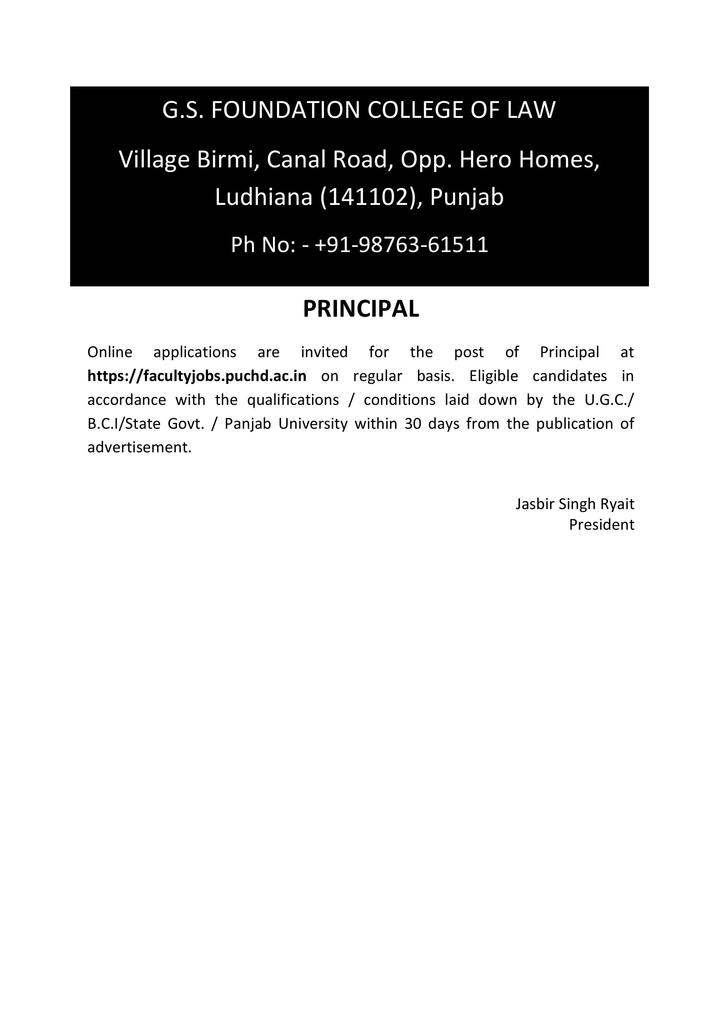 G.S. FOUNDATION COLLEGE OF LAW Village Birmi, Canal Road, Opp. Hero Homes, Ludhiana (141102), Punjab PRINCIPAL Online applications are invited for the post of Principal at https://facultyjobs.puchd.ac.in on regular basis. Eligible candidates in accordance with the qualifications / conditions laid down by the U.G.C./ NCTE/State Govt. / Panjab University within 30 days from the publication of advertisement. Jasbir Singh Ryait President