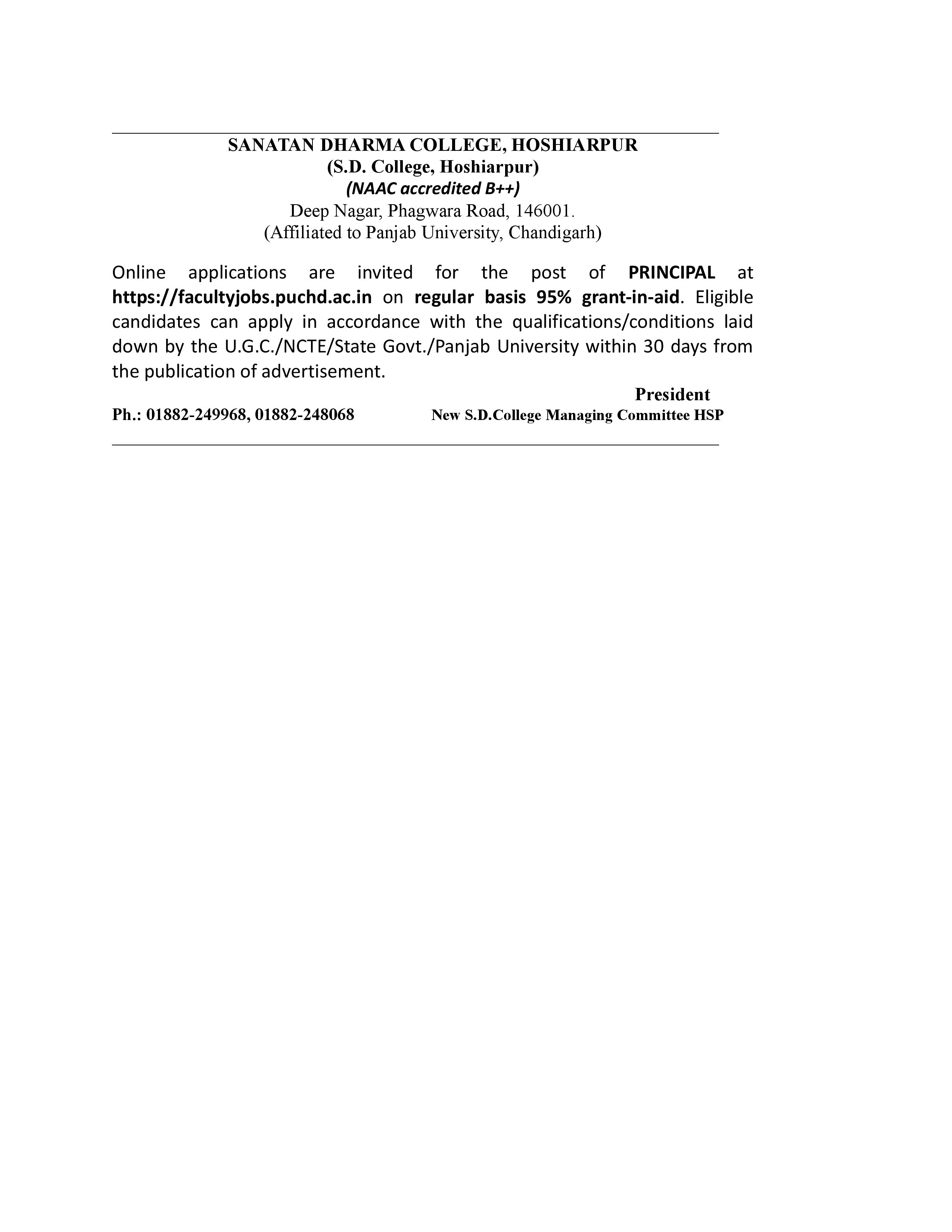 SANATAN DHARMA COLLEGE, HOSHIARPUR (S.D. College, Hoshiarpur) (NAAC accredited B++) Deep Nagar, Phagwara Road, 146001. (Affiliated to Panjab University, Chandigarh) Online applications are invited for the post of PRINCIPAL at https://facultyjobs.puchd.ac.in on regular basis 95% grant-in-aid. Eligible candidates can apply in accordance with the qualifications/conditions laid down by the U.G.C./NCTE/State Govt./Panjab University within 30 days from the publication of advertisement. President Ph.: 01882-249968, 01882-248068 New S.D.College Managing Committee HSP