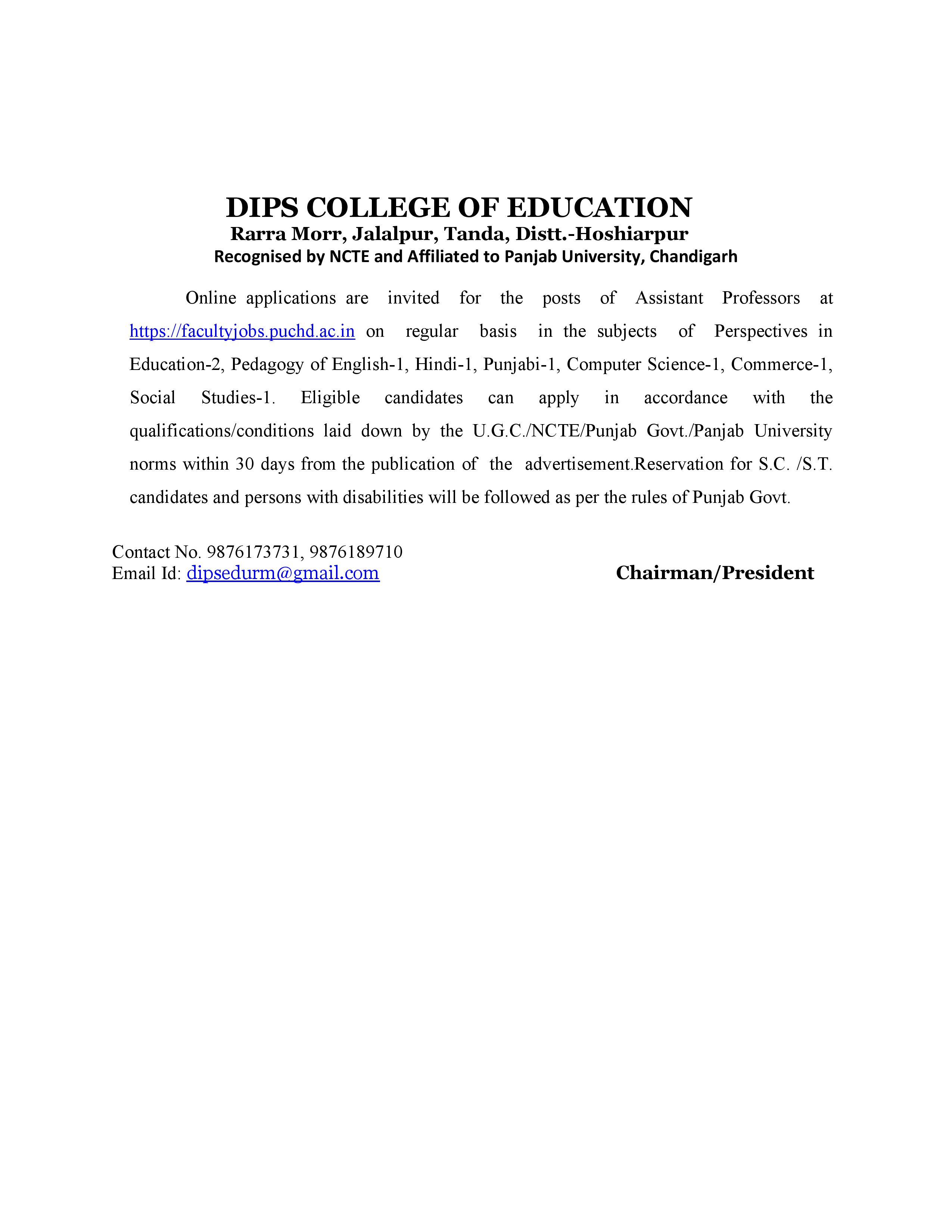 DIPS COLLEGE OF EDUCATION Rarra Morr, Jalalpur, Tanda, Distt.-Hoshiarpur Recognised by NCTE and Affiliated to Panjab University, Chandigarh Online applications are invited for the posts of Assistant Professors at https://facultyjobs.puchd.ac.in on regular basis in the subjects of Perspectives in Education-2, Pedagogy of English-1, Hindi-1, Punjabi-1, Computer Science-1, Commerce-1, Social Studies-1. Eligible candidates can apply in accordance with the qualifications/conditions laid down by the U.G.C./NCTE/Punjab Govt./Panjab University norms within 30 days from the publication of the advertisement.Reservation for S.C. /S.T. candidates and persons with disabilities will be followed as per the rules of Punjab Govt. Contact No. 9876173731, 9876189710 Email Id: dipsedurm@gmail.com Chairman/President