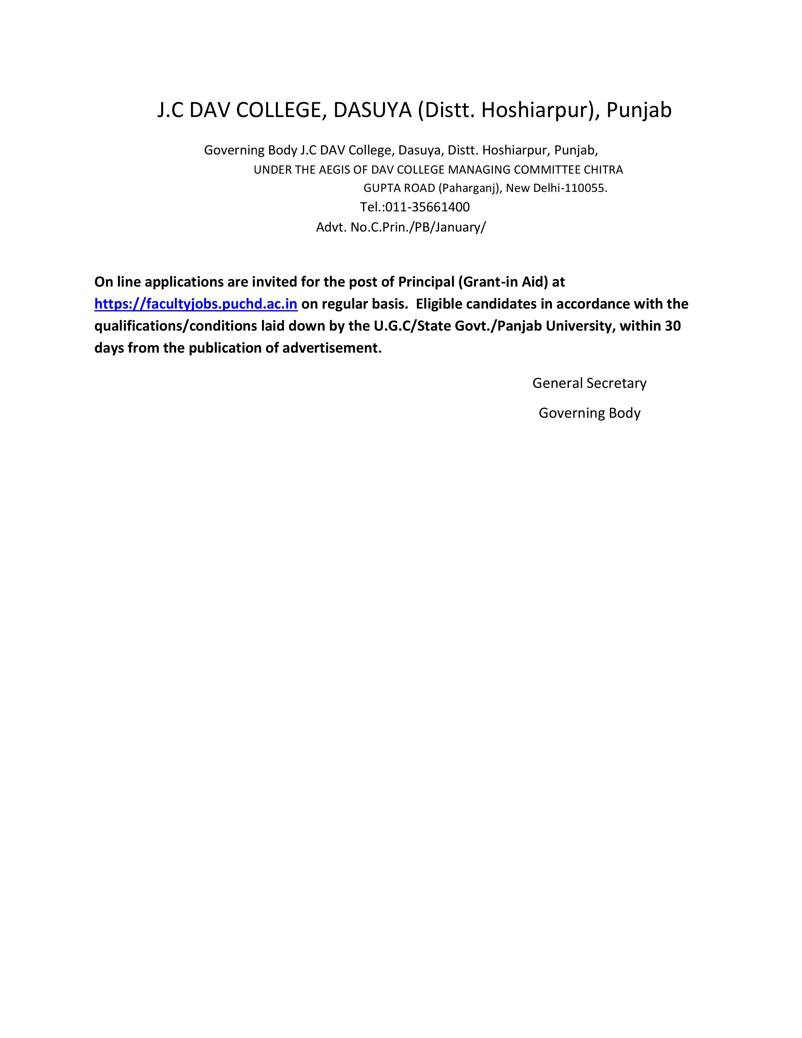 J.C DAV COLLEGE, DASUYA (Distt. Hoshiarpur), Punjab Governing Body J.C DAV College, Dasuya, Distt. Hoshiarpur, Punjab, UNDER THE AEGIS OF DAV COLLEGE MANAGING COMMITTEE CHITRA GUPTA ROAD (Paharganj), New Delhi-110055. Tel.:011-35661400 On line applications are invited for the post of Principal (Grant-in Aid) at https://facultyjobs.puchd.ac.in on regular basis. Eligible candidates in accordance with the qualifications/conditions laid down by the U.G.C/State Govt./Panjab University, within 30 days from the publication of advertisement. General Secretary Governing Body
