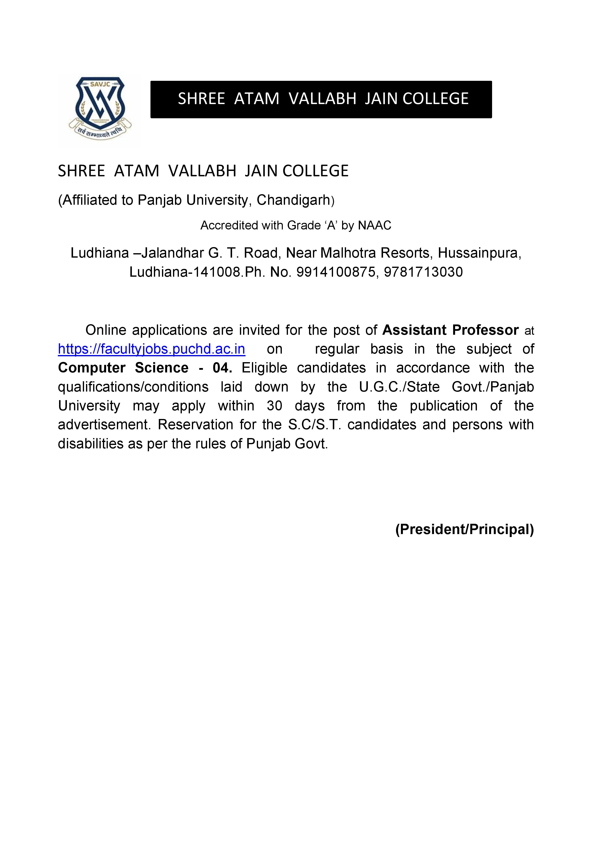 SHREE ATAM VALLABH JAIN COLLEGE (Affiliated to Panjab University, Chandigarh) Accredited with Grade ‘A’ by NAAC Ludhiana –Jalandhar G. T. Road, Near Malhotra Resorts, Hussainpura, Ludhiana-141008.Ph. No. 9914100875, 9781713030 Online applications are invited for the post of Assistant Professor at https://facultyjobs.puchd.ac.in on regular basis in the subject of Computer Science - 04. Eligible candidates in accordance with the qualifications/conditions laid down by the U.G.C./State Govt./Panjab University may apply within 30 days from the publication of the advertisement. Reservation for the S.C/S.T. candidates and persons with disabilities as per the rules of Punjab Govt. (President/Principal)