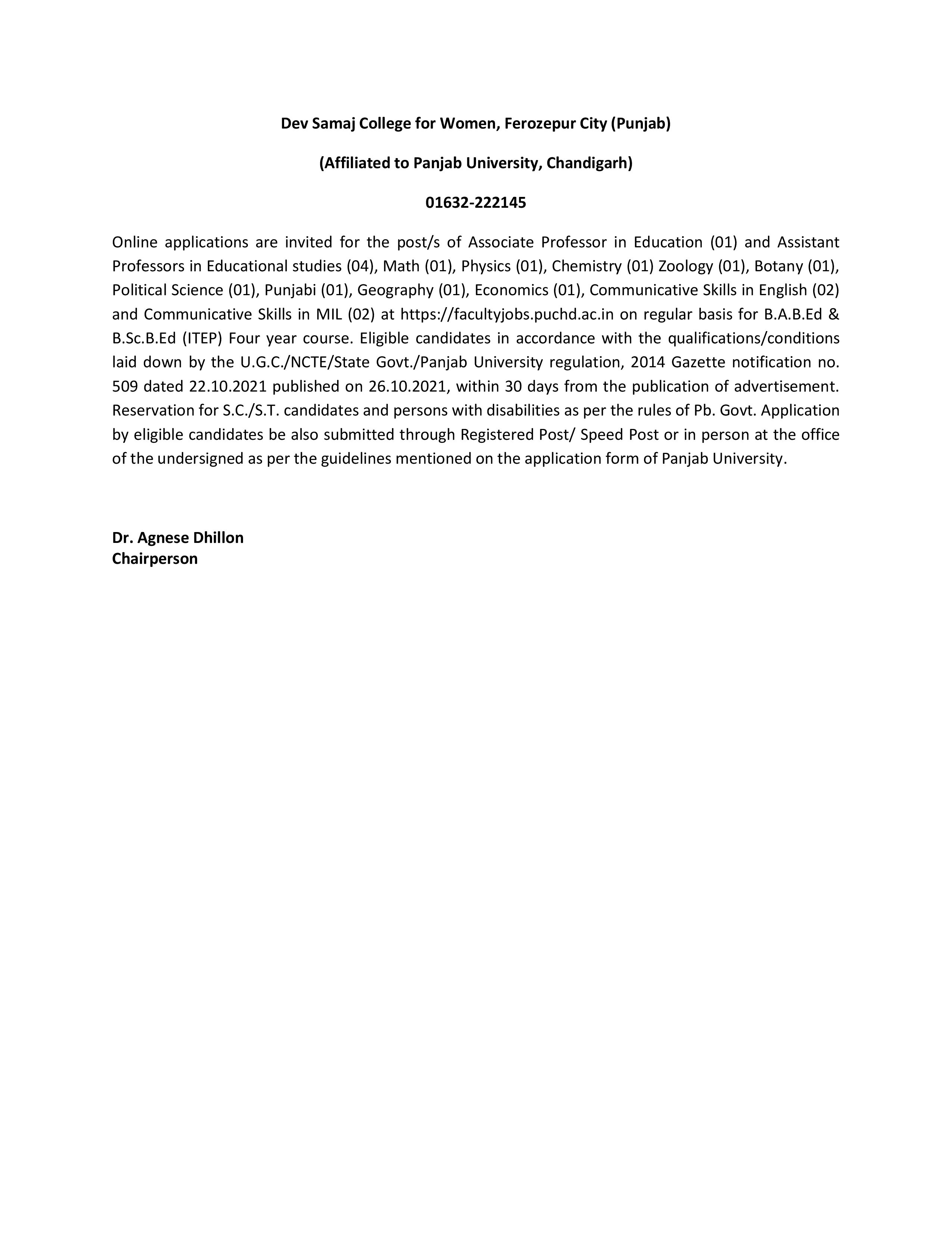 Sadbhavna College of Education for Women Raikot (A Self-Financed Unaided Private Affiliated College) Jalaldiwal, Raikot, Ludhiana -141109 (Punjab) Online applications are invited for the post/s of ASSISTANT PROFESSOR in the subject/s of Pedagogy of Commerce (01), Home Science (01), Punjabi (01) Science (01), Life Science (01), Social Studies (01), Economics (01) and Perspectives in Education (02) for B.Ed. course at https://facultyjobs.puchd.ac.in on regular basis. Eligible candidates in accordance with the qualifications/ conditions laid down by the U.G.C./NCTE/State Govt./Punjab University within 30 days from the publication of the advertisement. Reservation for S.C. /S.T. candidates and persons with disabilities as per the rules of Pb. Govt. President 7888553997, 9781112205