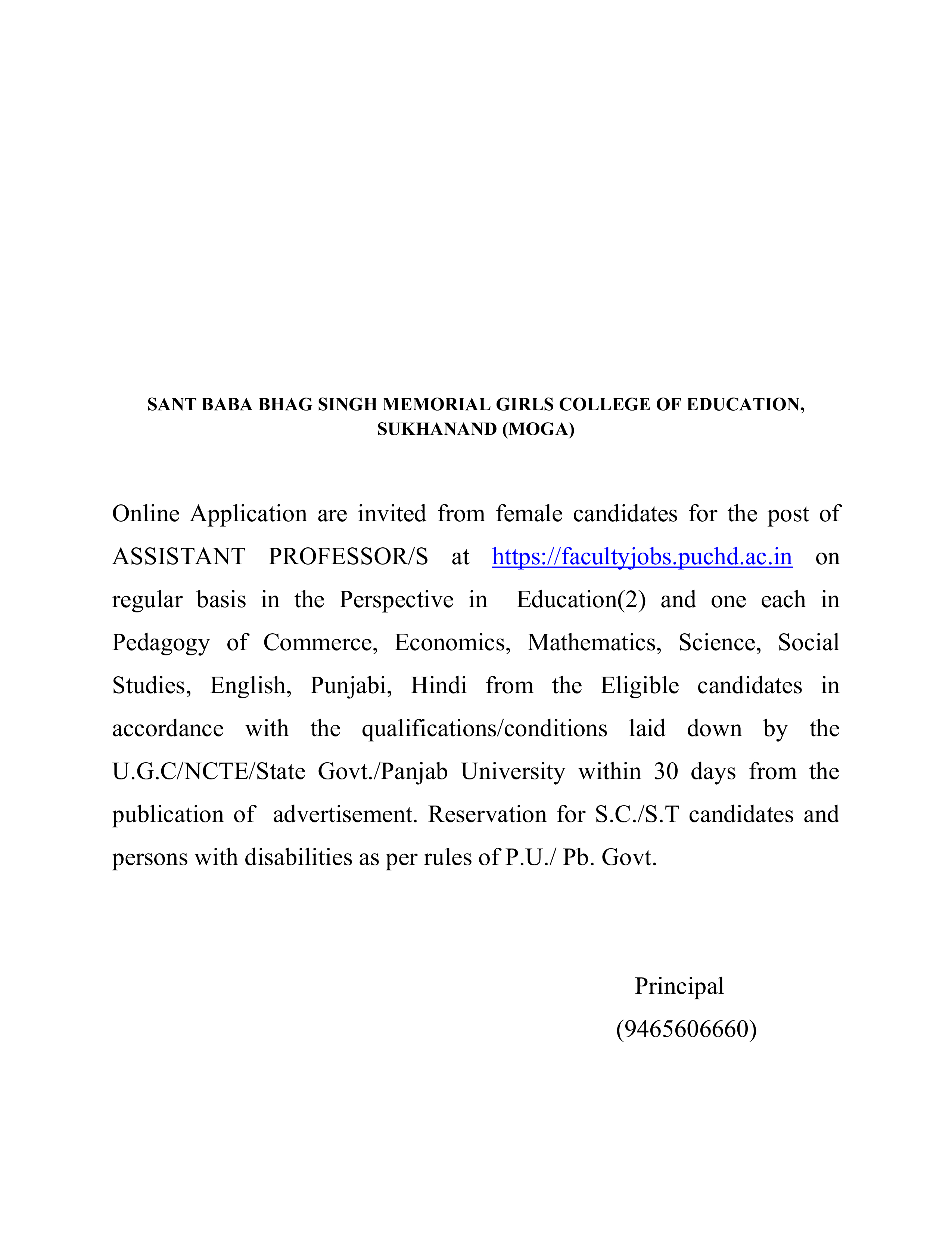 SANT BABA BHAG SINGH MEMORIAL GIRLS COLLEGE OF EDUCATION, SUKHANAND (MOGA) Online Application are invited from female candidates for the post of ASSISTANT PROFESSOR/S at https://facultyjobs.puchd.ac.in on regular basis in the Perspective in Education(2) and one each in Pedagogy of Commerce, Economics, Mathematics, Science, Social Studies, English, Punjabi, Hindi from the Eligible candidates in accordance with the qualifications/conditions laid down by the U.G.C/NCTE/State Govt./Panjab University within 30 days from the publication of advertisement. Reservation for S.C./S.T candidates and persons with disabilities as per rules of P.U./ Pb. Govt. Principal (9465606660)