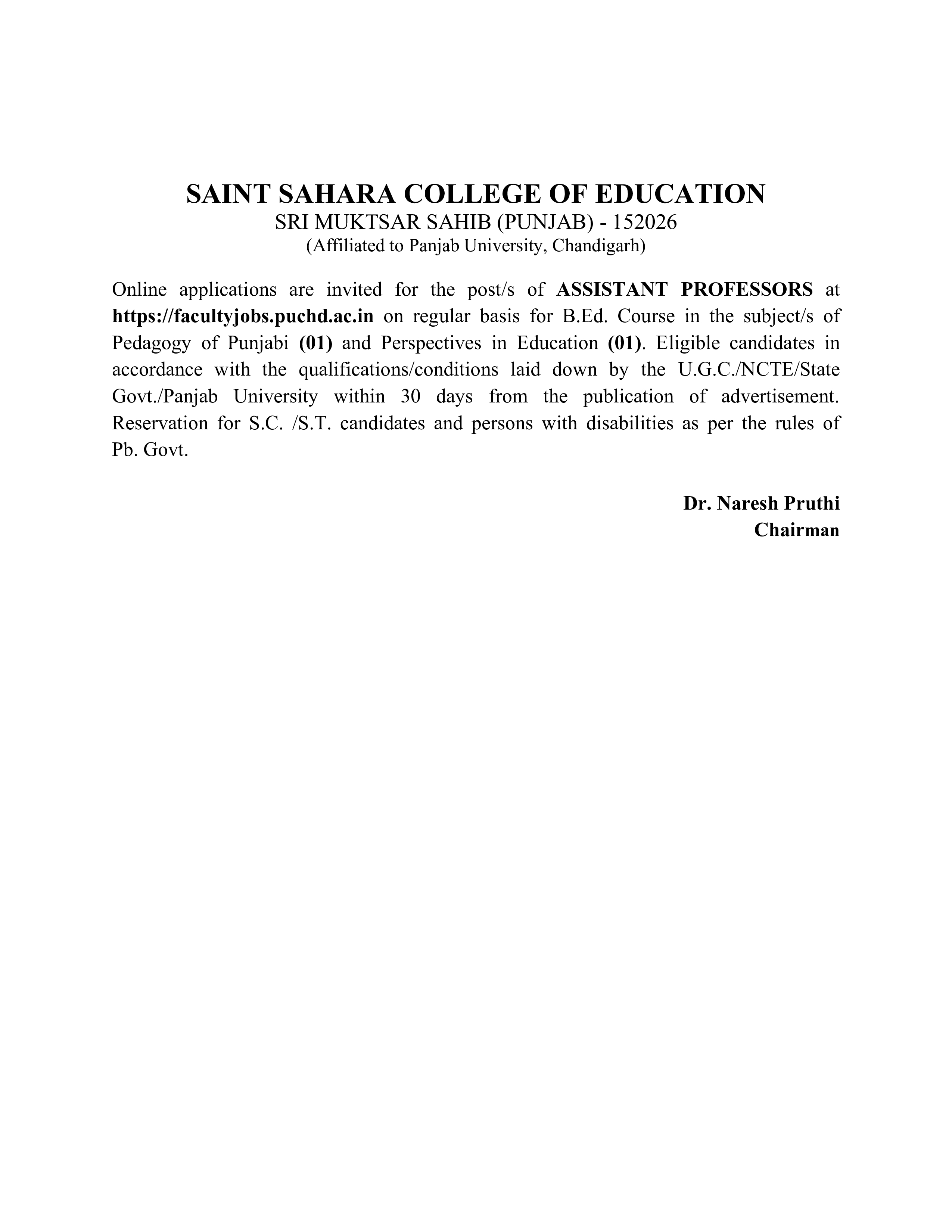 SAINT SAHARA COLLEGE OF EDUCATION SRI MUKTSAR SAHIB (PUNJAB) - 152026 (Affiliated to Panjab University, Chandigarh) Online applications are invited for the post/s of ASSISTANT PROFESSORS at https://facultyjobs.puchd.ac.in on regular basis for B.Ed. Course in the subject/s of Perspectives in Education (01) and Pedagogy Subjects: Science (01), English (01), Hindi (01), Social Studies (01) & Economics (01). Eligible candidates in accordance with the qualifications/conditions laid down by the U.G.C./NCTE/State Govt./Panjab University within 30 days from the publication of advertisement. Reservation for S.C. /S.T. candidates and persons with disabilities as per the rules of Pb. Govt. Dr. Naresh Pruthi Chairman