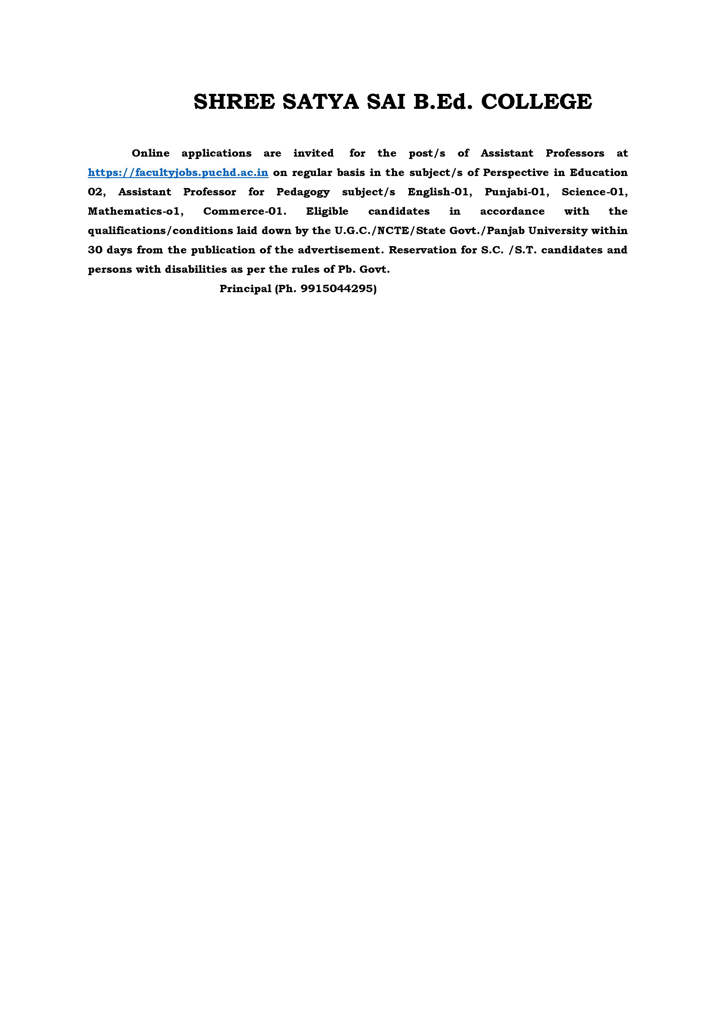SHREE SATYA SAI B.Ed. COLLEGE Online applications are invited for the post/s of Assistant Professors at https://facultyjobs.puchd.ac.in on regular basis in the subject/s of Perspective in Education 04, Assistant Professor in Education for Pedagogy subject/s Social Science/Studies-02, English-01, Punjabi-01, Hindi-01, Science-01, Commerce-01. Eligible candidates in accordance with the qualifications/conditions laid down by the U.G.C./NCTE/State Govt./Panjab University within 30 days from the publication of the advertisement. Reservation for S.C. /S.T. candidates and persons with disabilities as per the rules of Pb. Govt. Principal (Ph. 9915044295)
