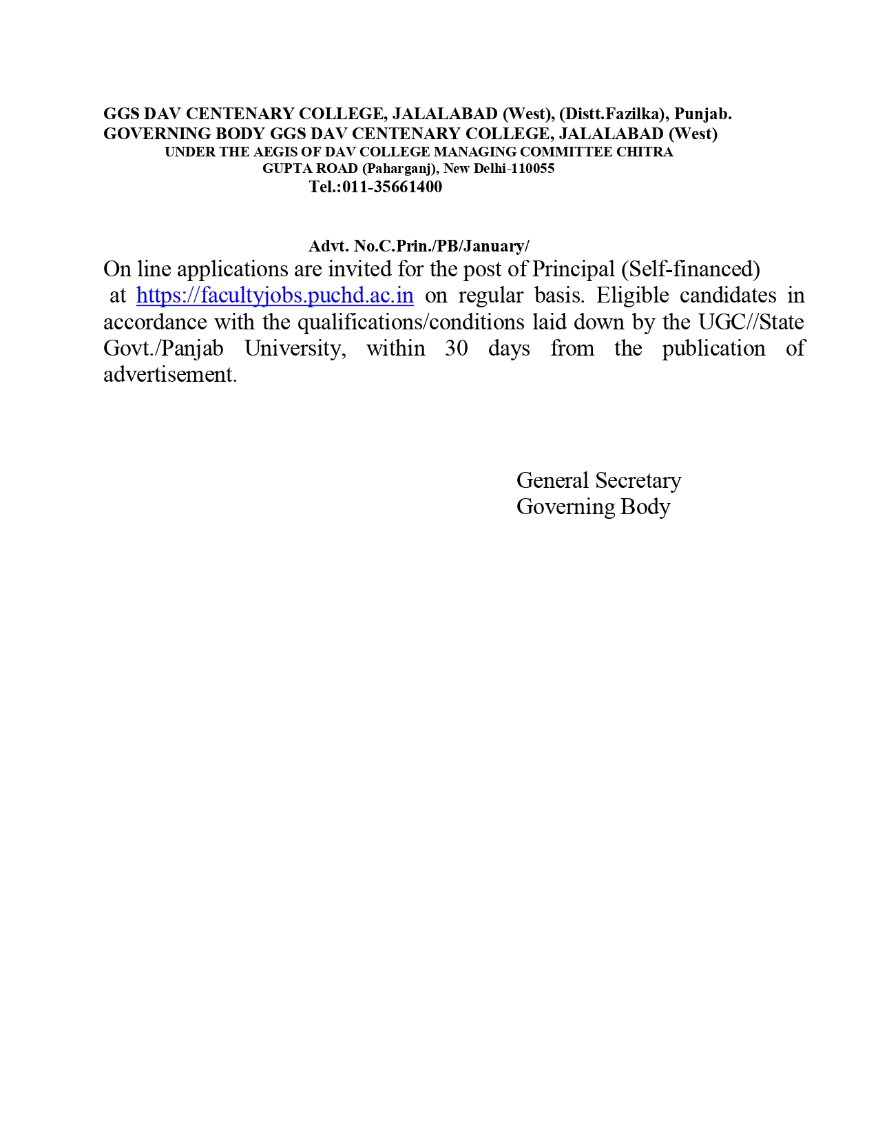 GGS DAV CENTENARY COLLEGE, JALALABAD (West), (Distt.Fazilka), Punjab. GOVERNING BODY GGS DAV CENTENARY COLLEGE, JALALABAD (West) UNDER THE AEGIS OF DAV COLLEGE MANAGING COMMITTEE CHITRA GUPTA ROAD (Paharganj), New Delhi-110055 Tel.:011-35661400 Advt. No.C.Prin./PB/January/ On line applications are invited for the post of Principal (Self-financed) at https://facultyjobs.puchd.ac.in on regular basis. Eligible candidates in accordance with the qualifications/conditions laid down by the UGC//State Govt./Panjab University, within 30 days from the publication of advertisement. General Secretary Governing Body