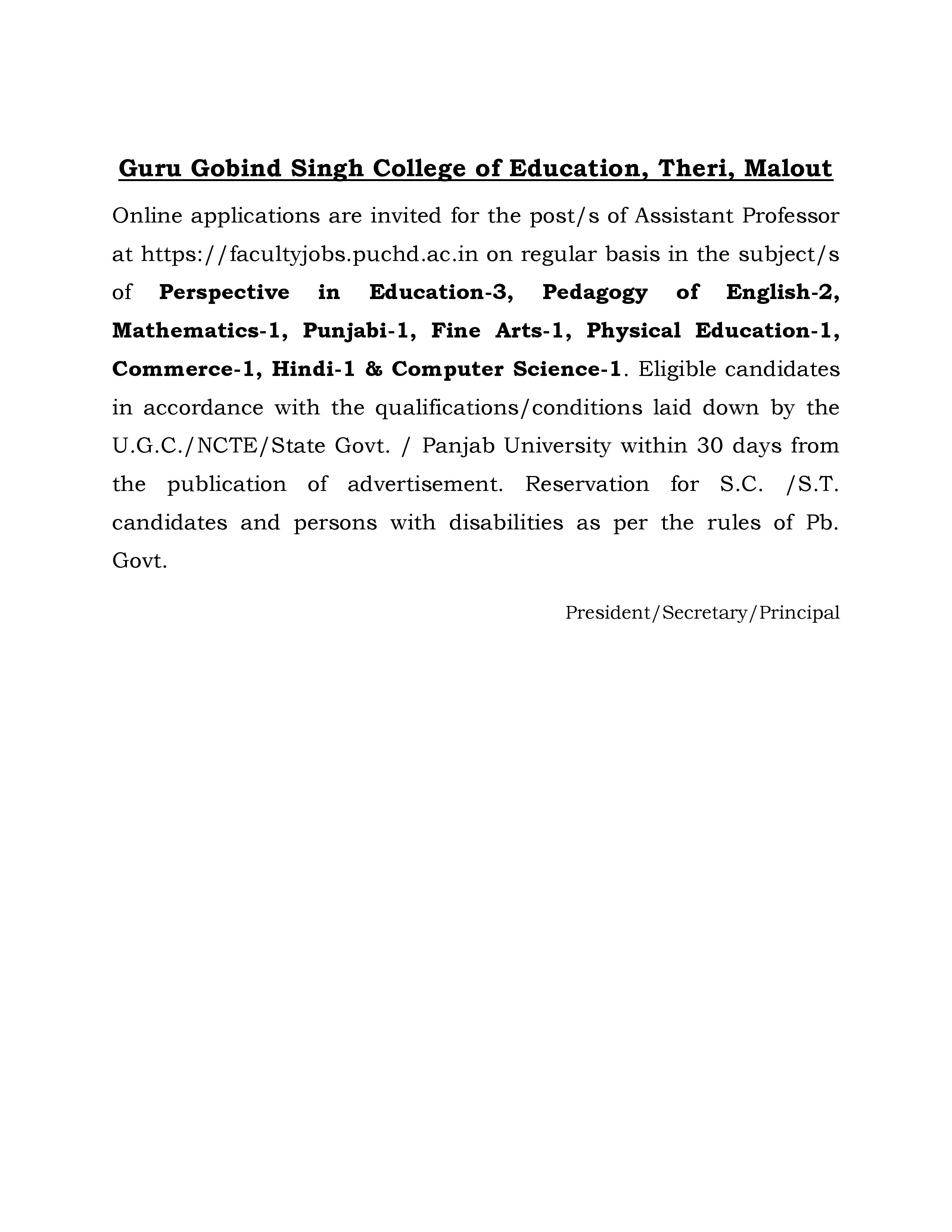 Guru Gobind Singh College of Education, Theri, Malout Online applications are invited for the post/s of Assistant Professor at https://facultyjobs.puchd.ac.in on regular basis in the subject/s of Perspective in Education-3, Pedagogy of English-2, Mathematics-1, Punjabi-1, Fine Arts-1, Physical Education-1, Commerce-1, Hindi-1 & Computer Science-1. Eligible candidates in accordance with the qualifications/conditions laid down by the U.G.C./NCTE/State Govt. / Panjab University within 30 days from the publication of advertisement. Reservation for S.C. /S.T. candidates and persons with disabilities as per the rules of Pb. Govt. President/Secretary/Principal