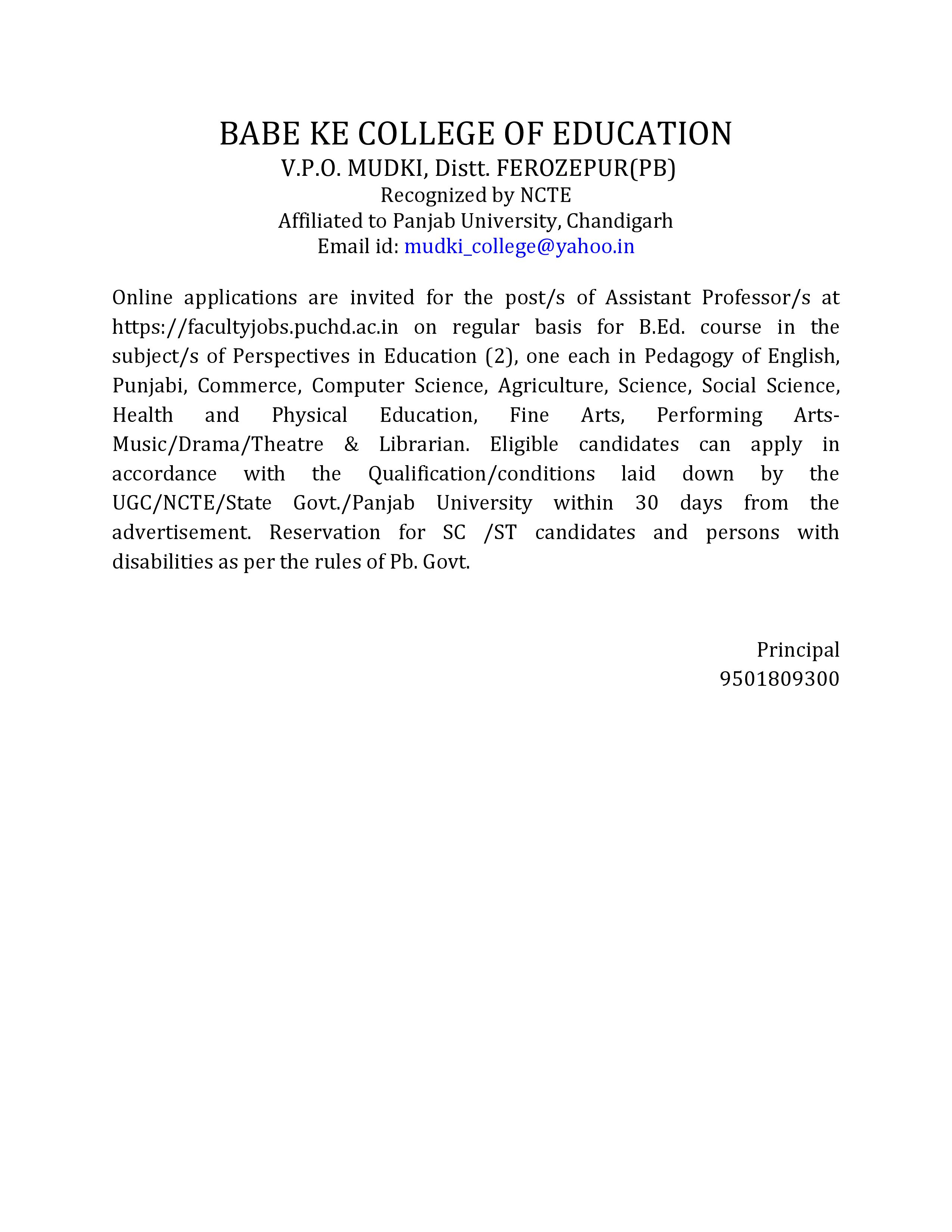 BABE KE COLLEGE OF EDUCATION V.P.O. MUDKI, Distt. FEROZEPUR(PB) Recognized by NCTE Affiliated to Panjab University, Chandigarh Email id: mudki_college@yahoo.in Online applications are invited for the post/s of Assistant Professor/s at https://facultyjobs.puchd.ac.in on regular basis for B.Ed. course in the subject/s of Perspectives in Education (2), one each in Pedagogy of English, Punjabi, Commerce, Computer Science, Agriculture, Science, Social Science, Health and Physical Education, Fine Arts, Performing Arts-Music/Drama/Theatre & Librarian. Eligible candidates can apply in accordance with the Qualification/conditions laid down by the UGC/NCTE/State Govt./Panjab University within 30 days from the advertisement. Reservation for SC /ST candidates and persons with disabilities as per the rules of Pb. Govt. Principal 9501809300