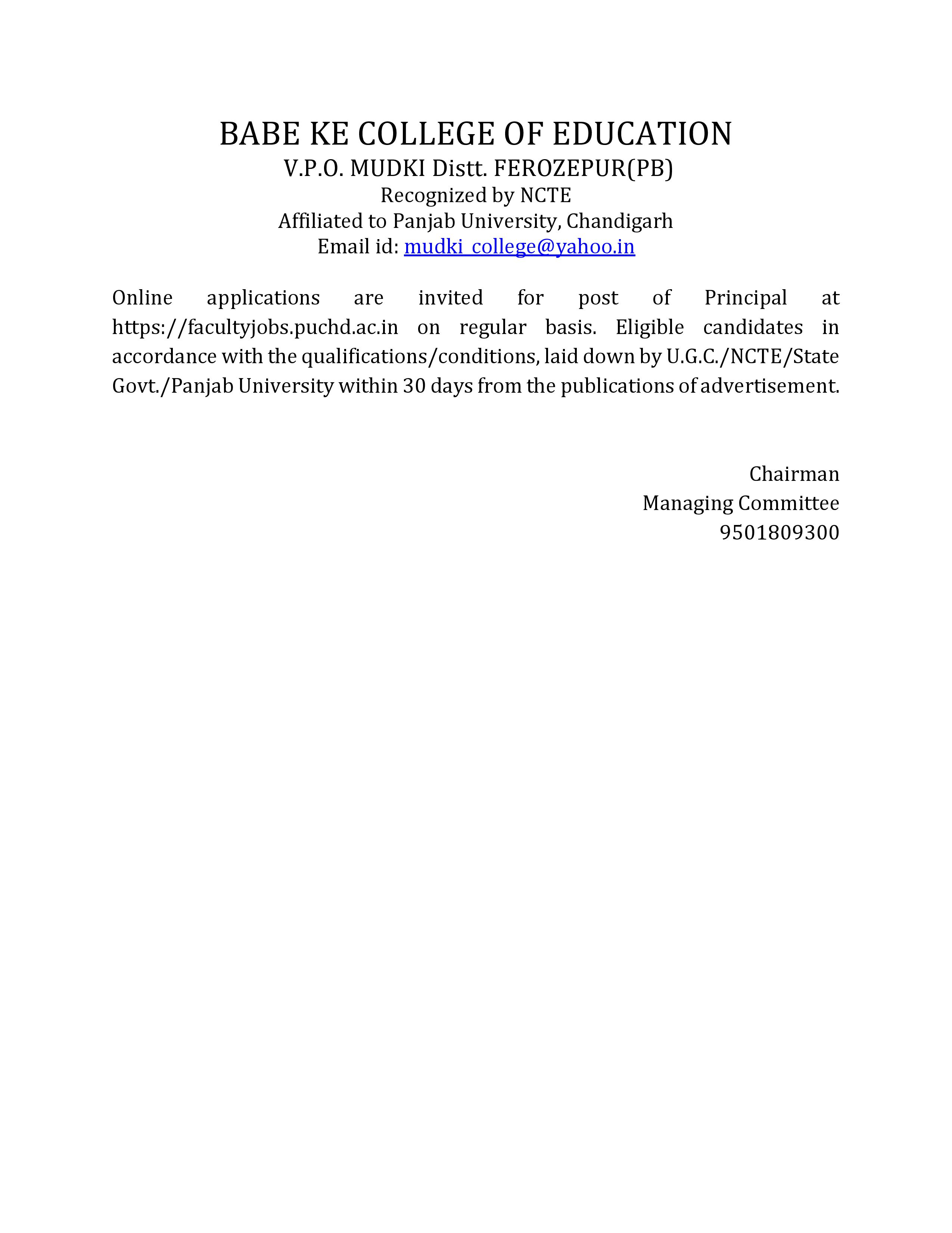 BABE KE COLLEGE OF EDUCATION V.P.O. MUDKI Distt. FEROZEPUR(PB) Recognized by NCTE Affiliated to Panjab University, Chandigarh Email id: mudki_college@yahoo.in Online applications are invited for post of Principal at https://facultyjobs.puchd.ac.in on regular basis. Eligible candidates in accordance with the qualifications/conditions, laid down by U.G.C./NCTE/State Govt./Panjab University within 30 days from the publications of advertisement. Chairman Managing Committee 9501809300