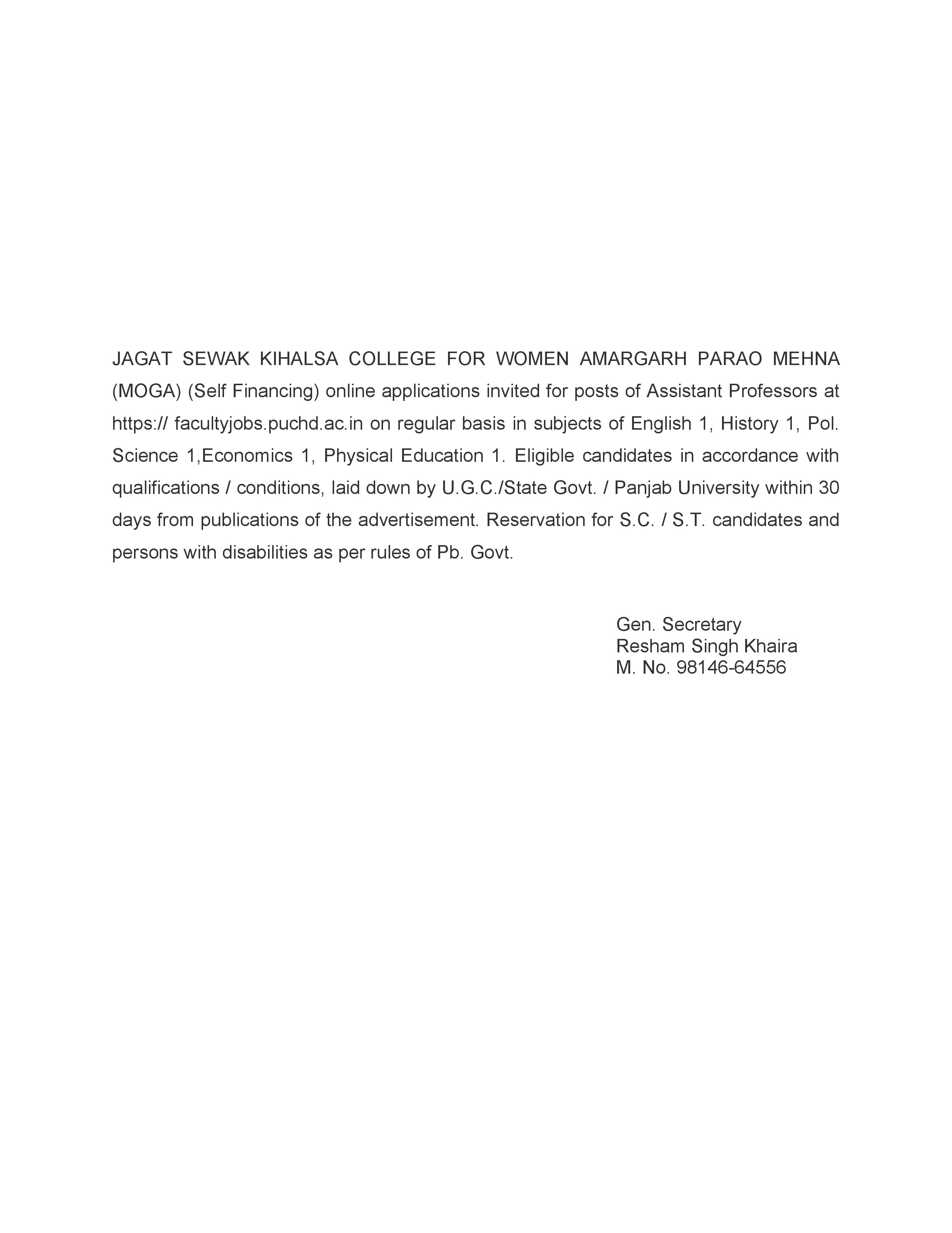 JAGAT SEWAK KIHALSA COLLEGE FOR WOMEN AMARGARH PARAO MEHNA (MOGA) (Self Financing) online applications invited for posts of Assistant Professors at https:// facultyjobs.puchd.ac.in on regular basis in subjects of English 1, History 1, Pol. Science 1,Economics 1, Physical Education 1. Eligible candidates in accordance with qualifications / conditions, laid down by U.G.C./State Govt. / Panjab University within 30 days from publications of the advertisement. Reservation for S.C. / S.T. candidates and persons with disabilities as per rules of Pb. Govt. Gen. Secretary Resham Singh Khaira M. No. 98146-64556